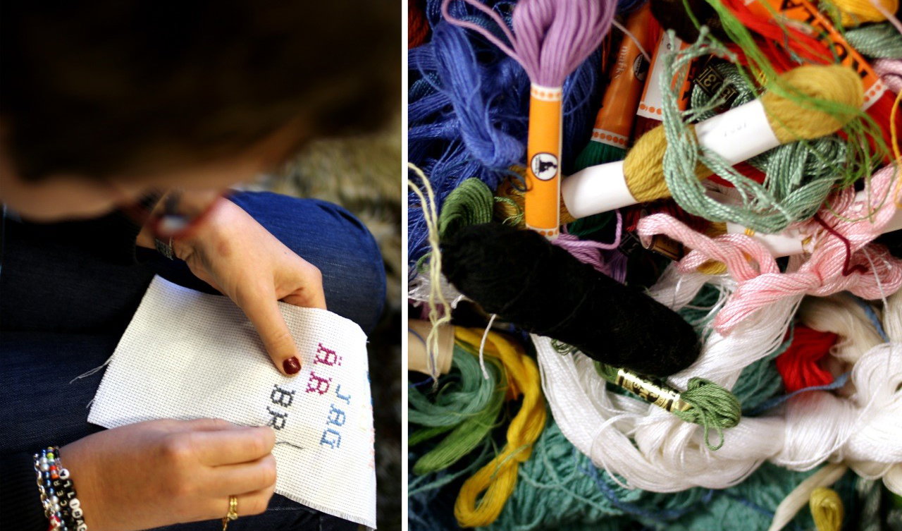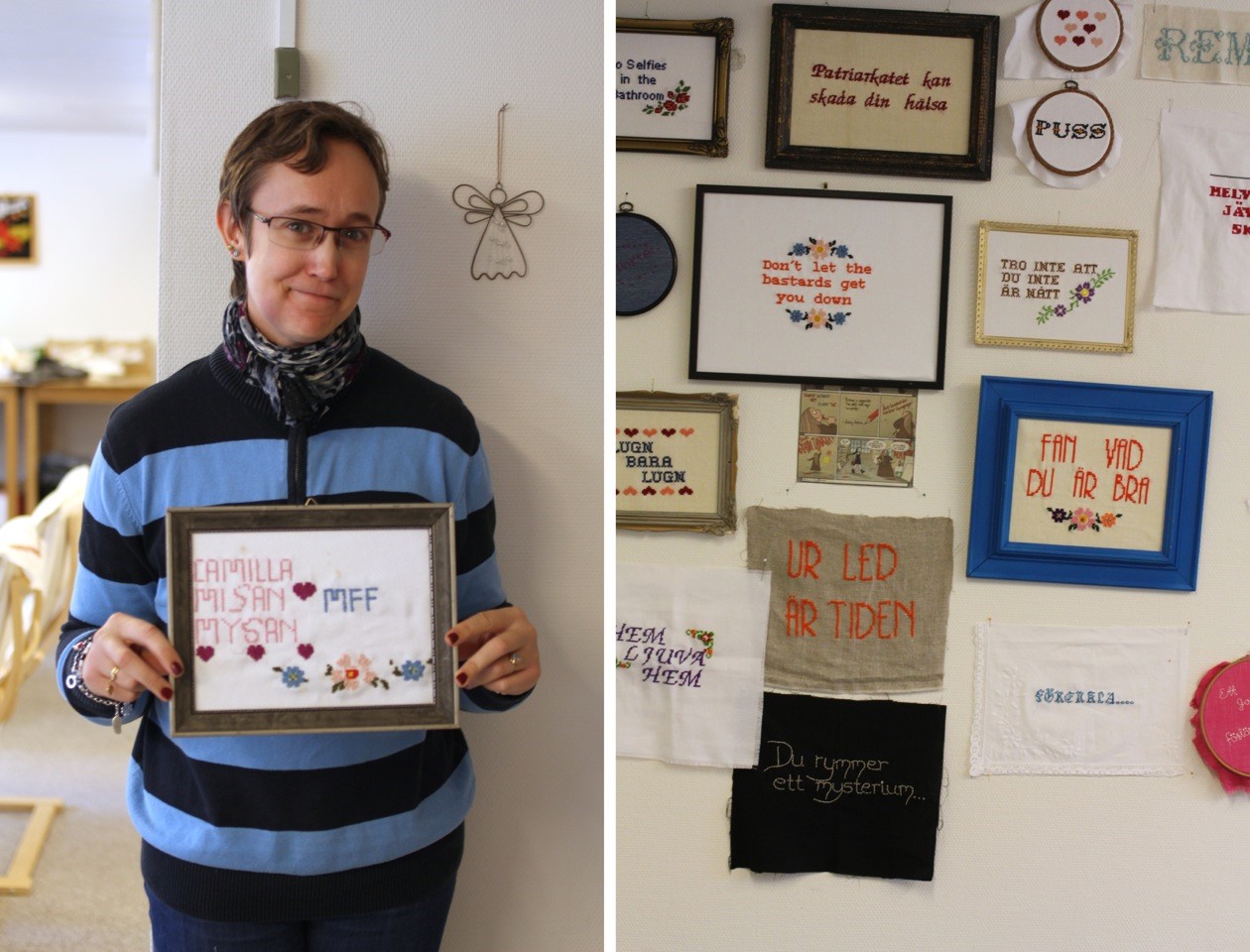 Just nu jobbar vi med att brodera tavlor med vardagspoesi och roliga uttryck på. Dessa tavlor ska inom det närmaste skickas ut till secondhandbutikerna och säljas där. Det har under åren som gått skänkts en massa broderigarn till insamlingen, och tillsammans med kasserade ramar skapar vi nya saker av material som annars skulle ha kastats. Vi ha broderat i några veckor nu och väggen fylls långsamt på av fler och fler unika skapelser. Nu är det så fint att det kommer vara svårt att skiljas från alla broderier när det väl är dags!