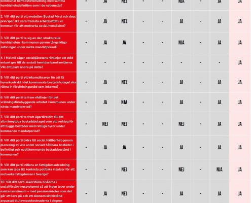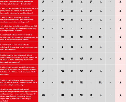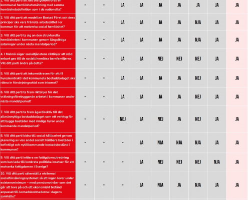 Glädjande i vår lokala valkompass är att majoriteten av partierna ser nyttan i årliga och jämförbara kartläggningar av hemlösheten i aktuell kommun. Merparten ser också vikten i ett bra vräkningsförebyggande arbete, och modellen Bostad Först – en modell som syftar till att underlätta för människor i missbruk att ha ett eget boende, som Sveriges Stadsmissioner varit med och utvecklat i Sverige – har högt förtroende.