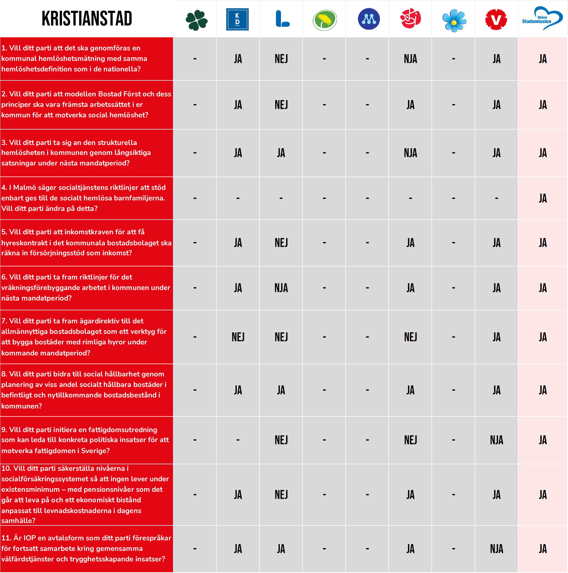 Riksorganisationen Sveriges Stadsmissioner, där Skåne Stadsmission är medlem, har ställt motsvarande frågor till riksdagspartierna. Den valkompassen hittar du här.