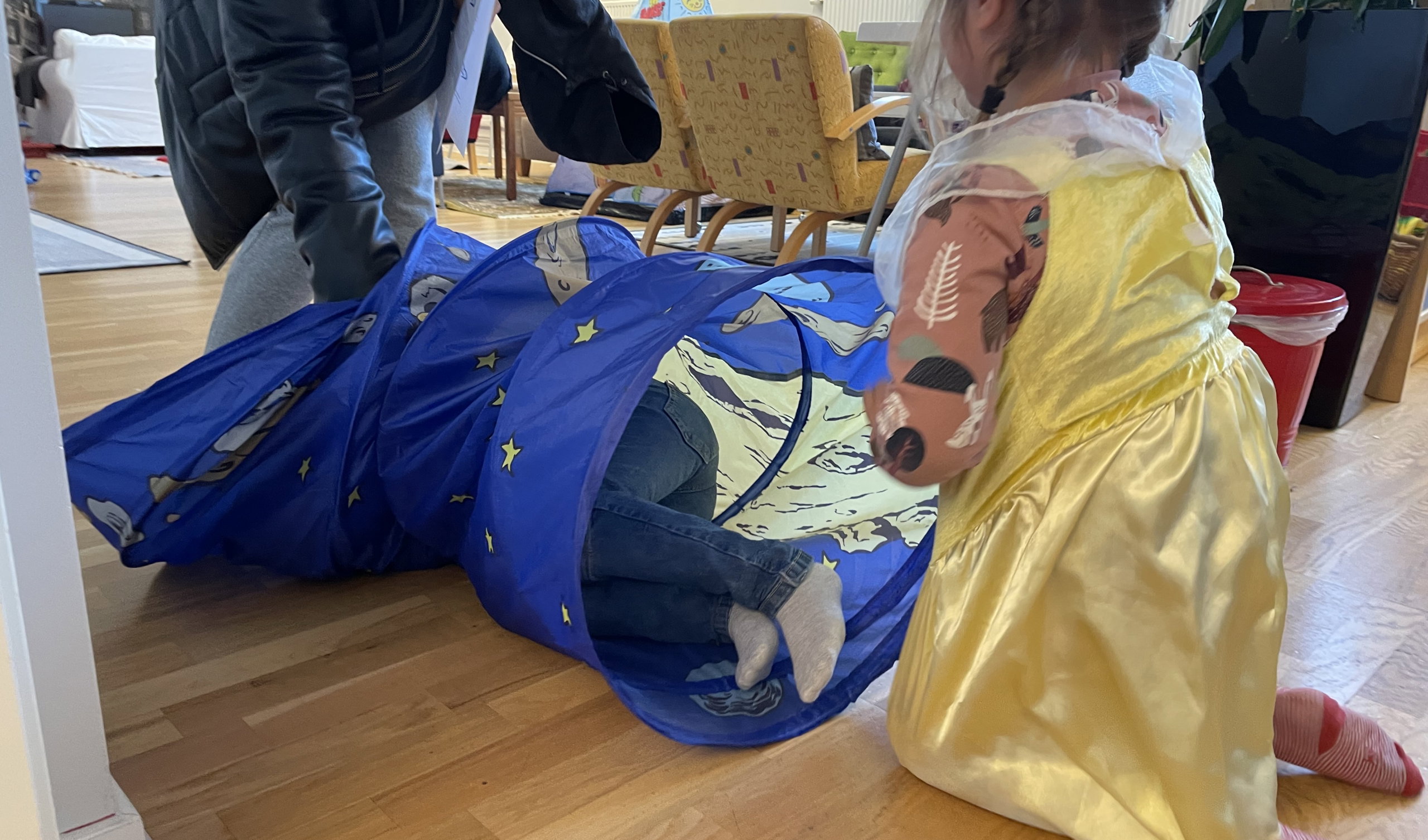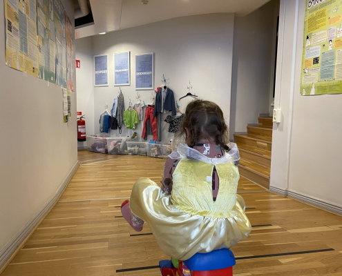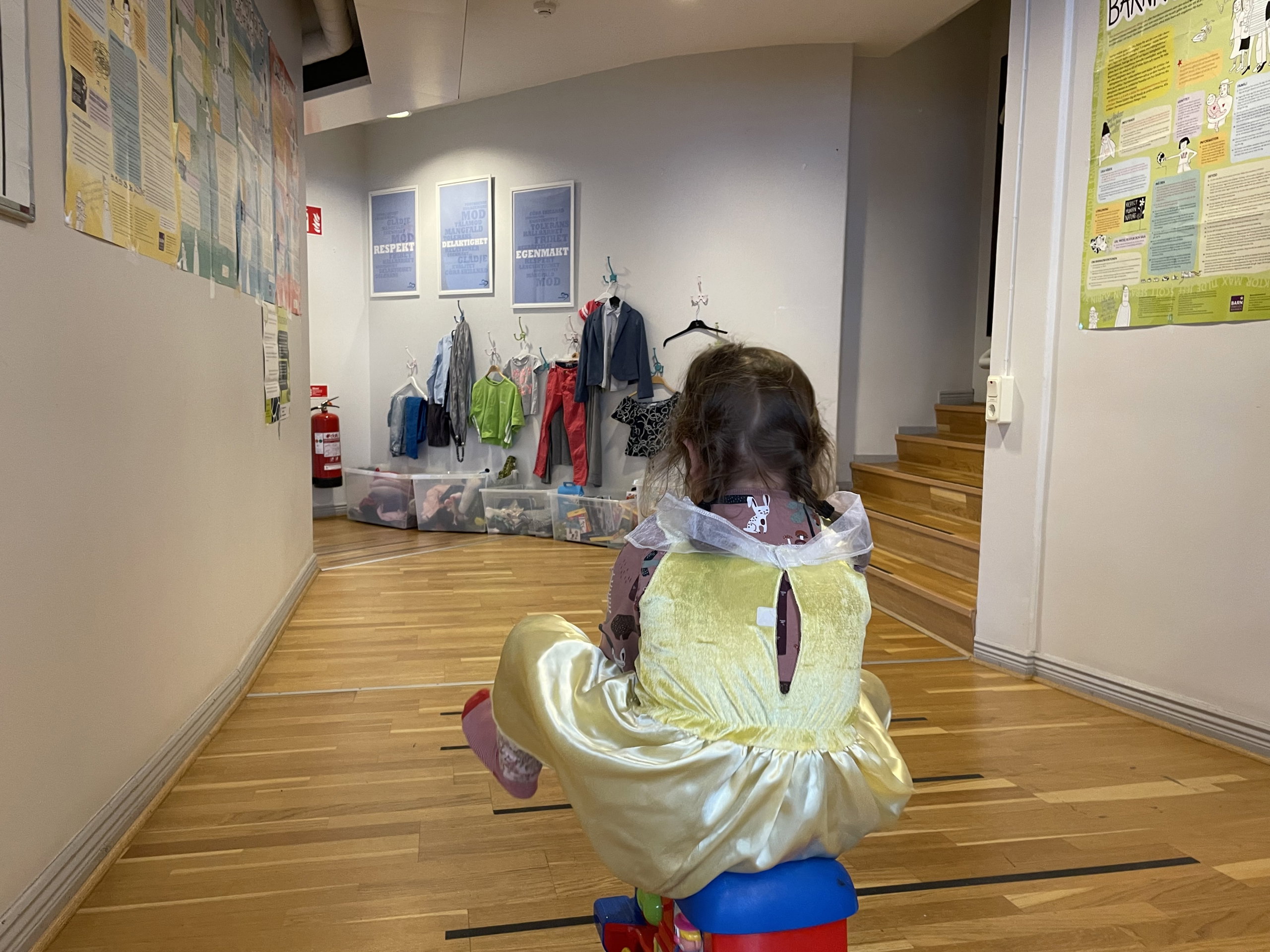 Hon är 3,5 och sitter bara tillfälligt stilla. En rostad macka och ett chokladkex slinker ner och hon torkar munnen ordentligt innan hon ger sig ut i leken igen. Kastar sig på den färgglada lilla bilen och kör i rasande fart genom lokalen. Just nu är bara hon och hennes mamma här, och hon har hela personalens fulla uppmärksamhet medan mamma botaniserar i klädrummet.