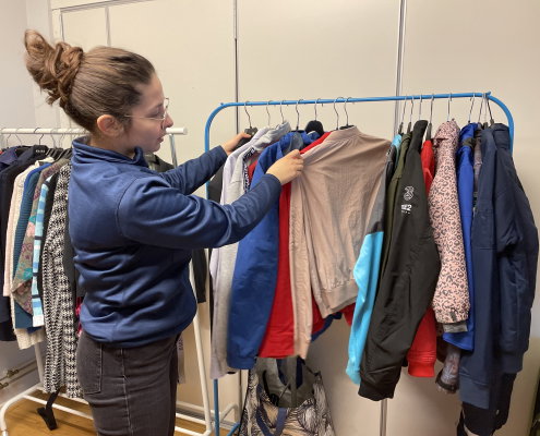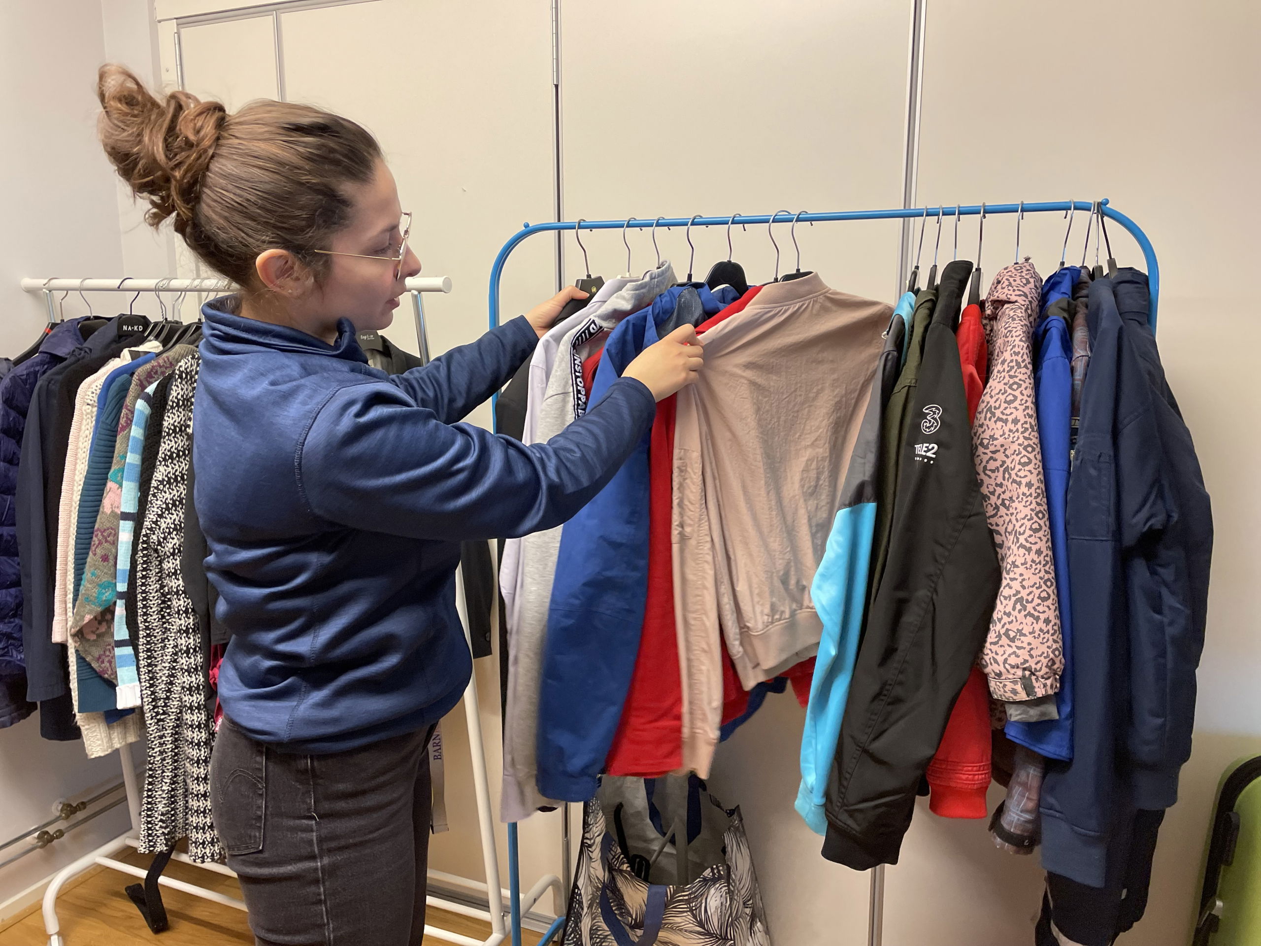 På mötesplatsen finns ett helt rum med kläder, som fylls på efter hand. Här kan människor prova och välja i lugn och ro. Vi har köpt in hygienartiklar som blöjor, bindor, deodorant, och rena underkläder. Barnen får leksaker och pyssel med sig hem.